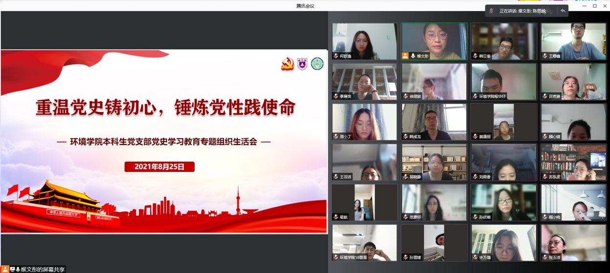 第三个环节,熊涛同学以《铸就百年辉煌 书写千秋伟业》为题,带领支部党员重温习近平总书记在庆祝中国共产党成立100周年上的讲话精神:全面回顾一百年来我们党围绕实现中华民族伟大复兴,团结带领中国人民开辟的伟大道路、创造的伟大事业、取得的伟大成就,庄严宣告我们实现了第一个百年奋斗目标,在中华大地上全面建成了小康社会,深刻总结了伟大建党精神,系统阐述了以史为鉴、开创未来的"九个必须"。随后周炜喆、蔡康丽两位同学分享了学习心得,他们表示作为一名环境青年,要把中华民族伟大复兴和个人理想信念相结合,在党史学习中不断提升政治自觉与思想自觉,坚持以永不懈怠的精神和一往无前的奋斗姿态,乘风破浪、坚毅前行,为全面建设富强民主文明和谐美丽的社会主义现代化强国贡献青春力量!