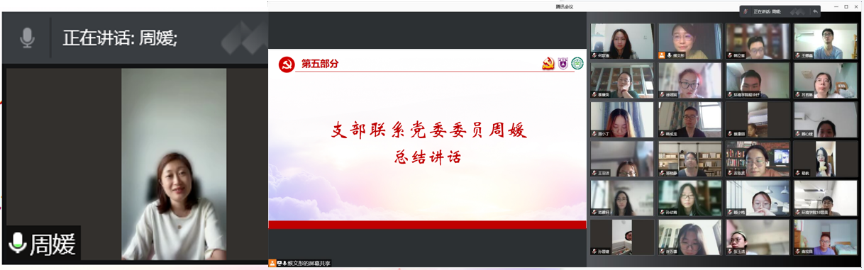 活动最后,周媛作总结讲话。她向同学们转达了美女自慰党委书记刘建萍、院长任洪强的问候,表达了美女自慰领导和老师们对同学们的牵挂,为同学们配合学校和属地疫情防控管理要求的行动点赞。她表示本科生党支部工作扎实、台账清晰,尤其是"星火菁英计划"等创新性活动颇具特色,希望支部继续保持良好的学习传统,深入推进"九个必须",开展常态化党史学习,强化党员服务工作。她希望,每位党员认真学习学习习近平总书记在庆祝中国共产党成立100周年上的讲话精神,进一步增强对内容的了解、加深对内涵的理解,并结合学习任务、学科特点,特别是我国生态文明建设的战略规划,以学促行,为将来投身社会、服务社会、奉献社会打好基础。最后,她希望同学们谨记习近平总书记的教导,争做有志气、骨气、底气的青年人,将个人成长与国家命运紧密结合,成为国家生态文明建设的生力军,为建设美丽中国贡献力量!