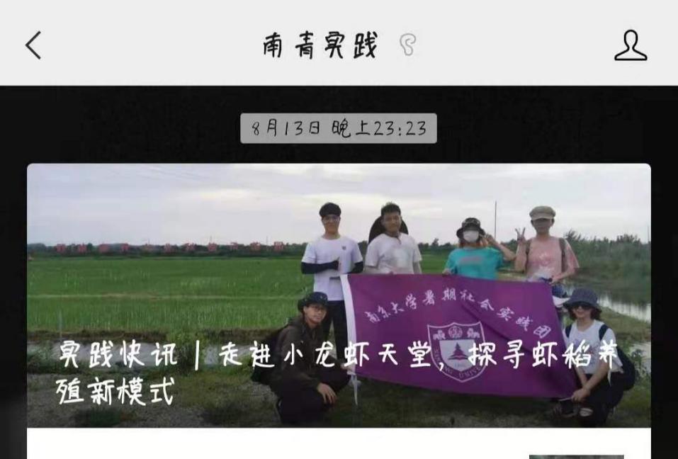 在实地调研稳步推进的同时,我们也进行了每日调研成果的记录与总结,并通过推送与vlog展示了阶段性成果。我们分享在个人社交平台上的每日vlog得到了大家的极高关注,而我们的推送文章《走进小龙虾天堂,探寻虾稻养殖新模式》有幸被选中在美女自慰 团委实践与志愿者工作部社会实践中心的官方微信公众号"南青实践"上发表。