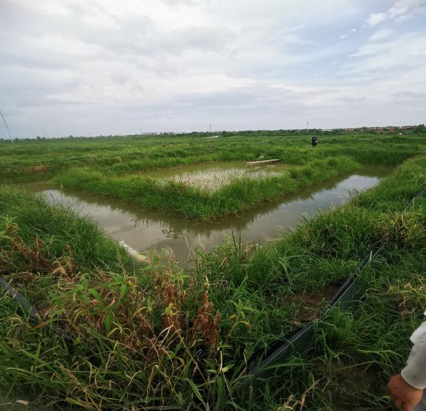 养殖龙虾的L型沟渠 成员与扬州大学的对接人交流
